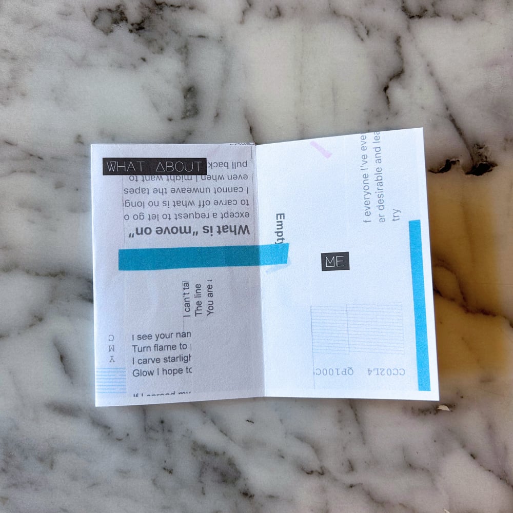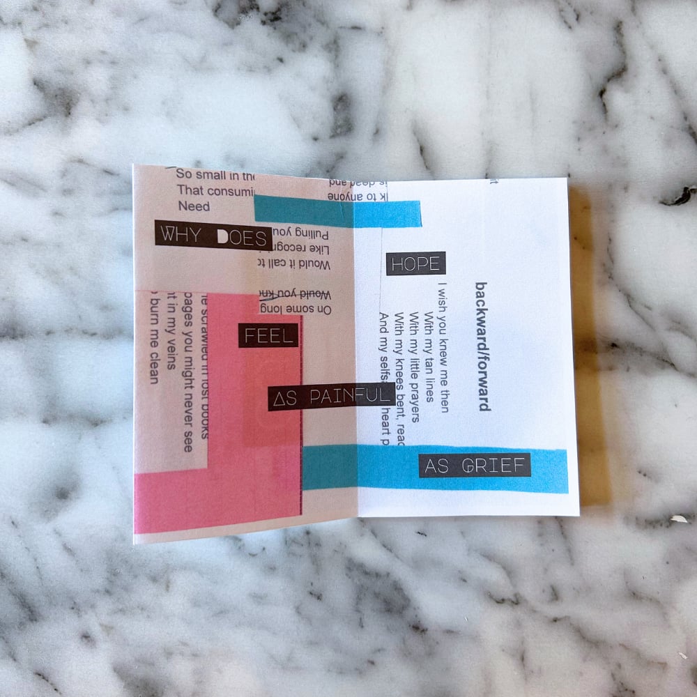 QUILT is an abstract collage zine in the style of an improvisational quilt, dealing with themes of grief and loss. It is hand-collaged, with digital text overlays. Made of paper scraps and feelings.